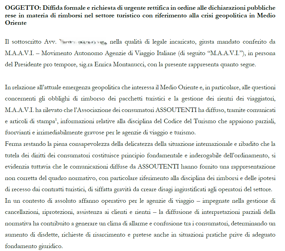 Assoutenti informa i cittadini di aver ricevuto in data 12 marzo 2026 una diffida formale da parte del Movimento Autonomo Agenzie di Viaggio Italiane (M.A.A.V.I.), relativa a un nostro recente comunicato stampa riguardante i diritti dei viaggiatori nell’ambito della crisi geopolitica in Medio Oriente.