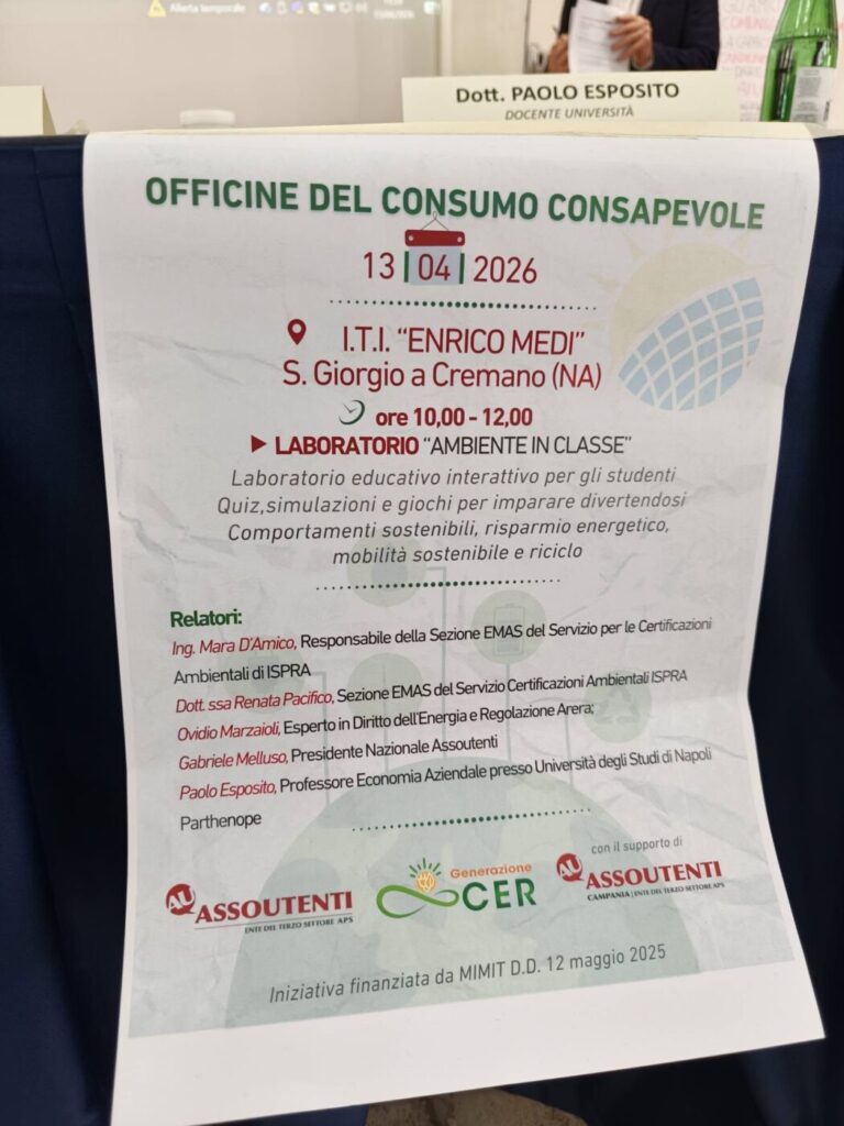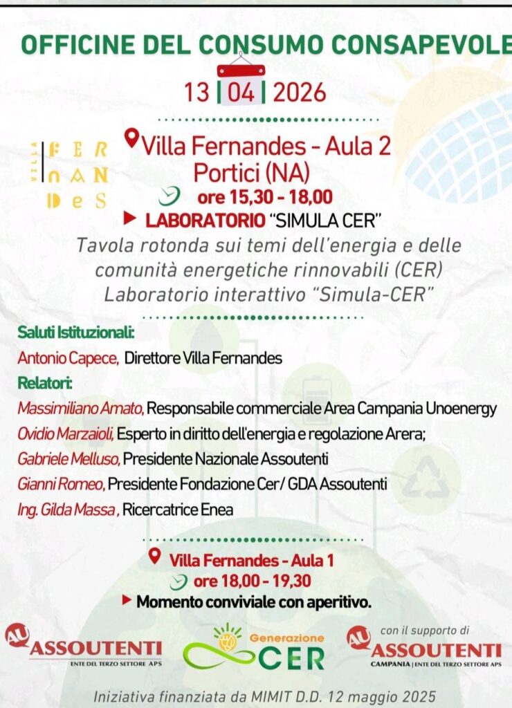 Si è concluso con grande partecipazione l’appuntamento campano delle Officine del Consumo Consapevole, il percorso promosso da Assoutenti nell’ambito del progetto Generazione CER, che ha coinvolto studenti, cittadini ed esperti in una giornata dedicata alla sostenibilità e alla transizione energetica.